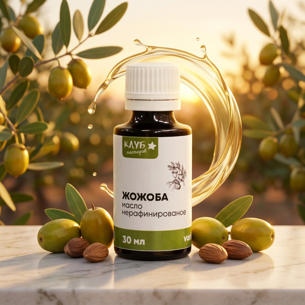 Метод получения: Масло жожоба не является маслом как таковым, а представляет собой жидкий воск, получаемый методом холодного прессования из семян кустарника симондсии китайской (орехов).